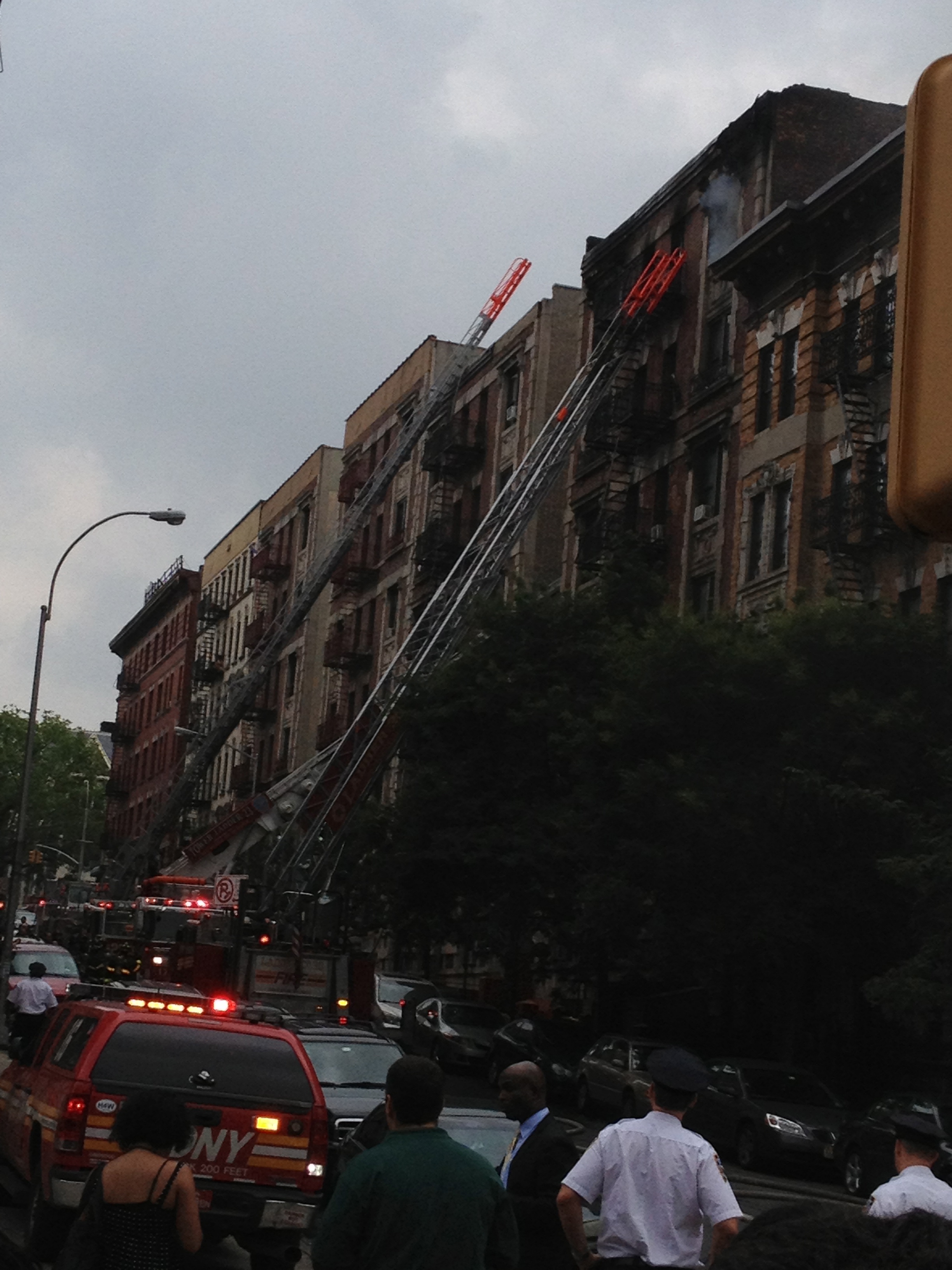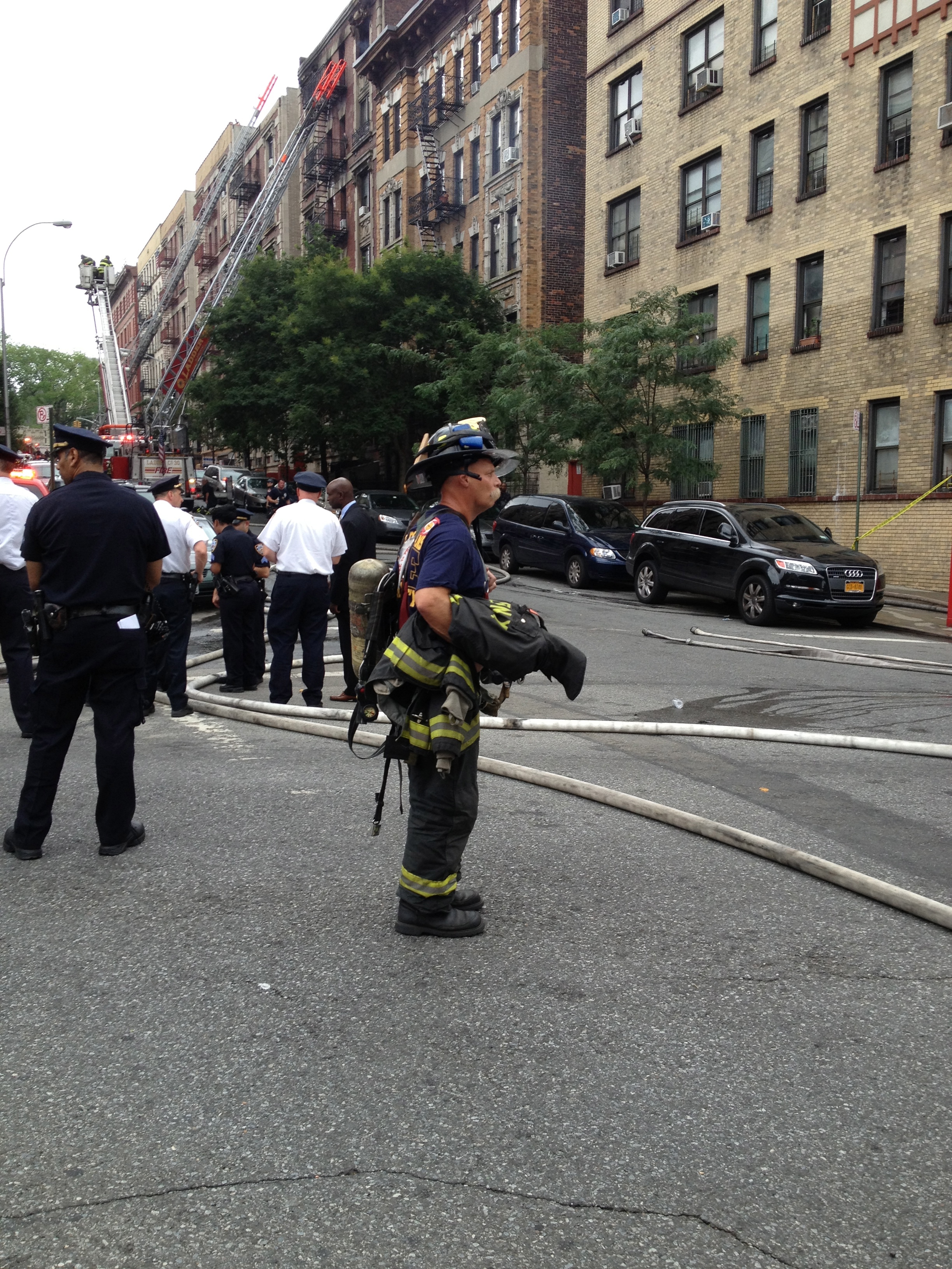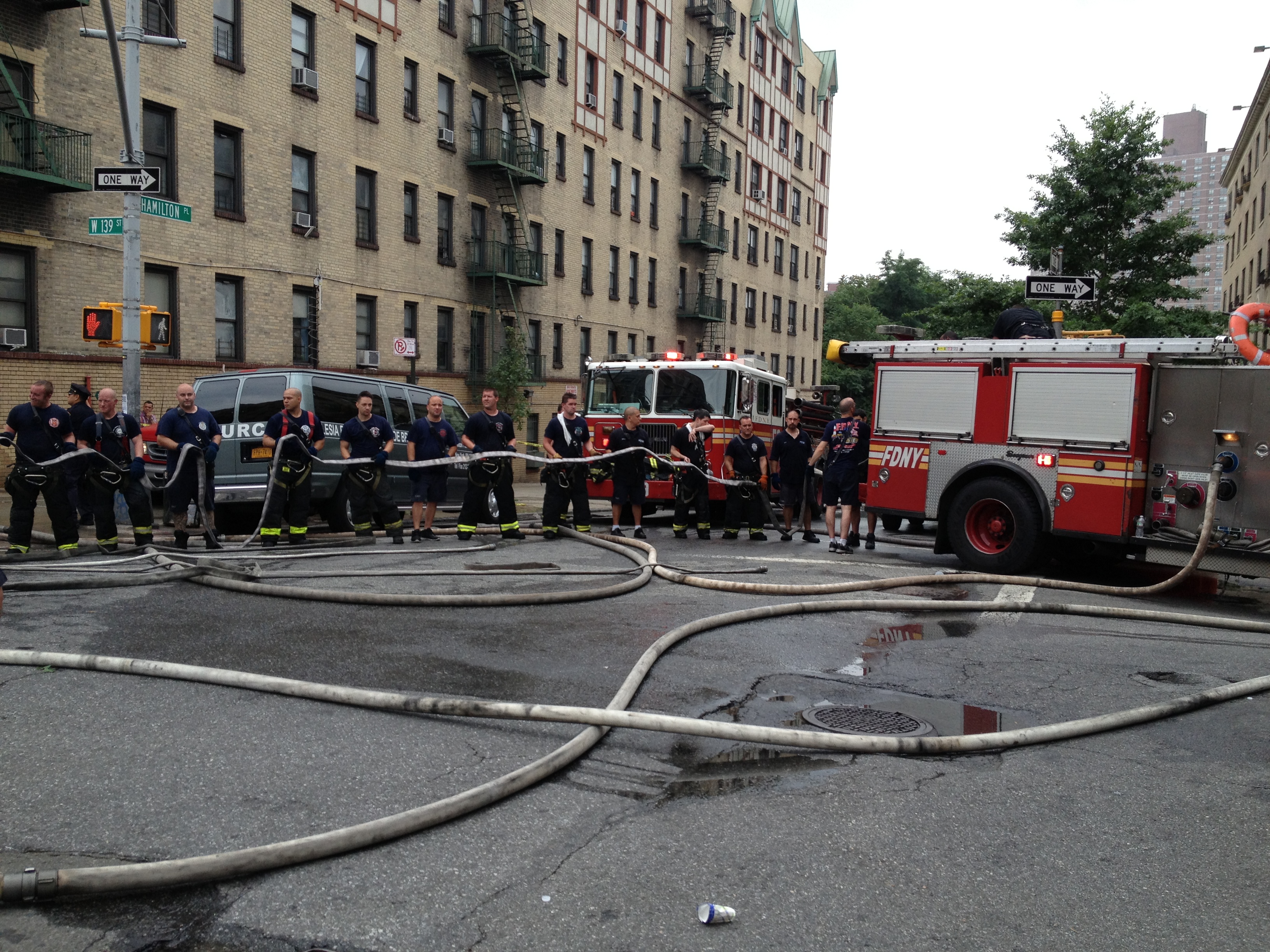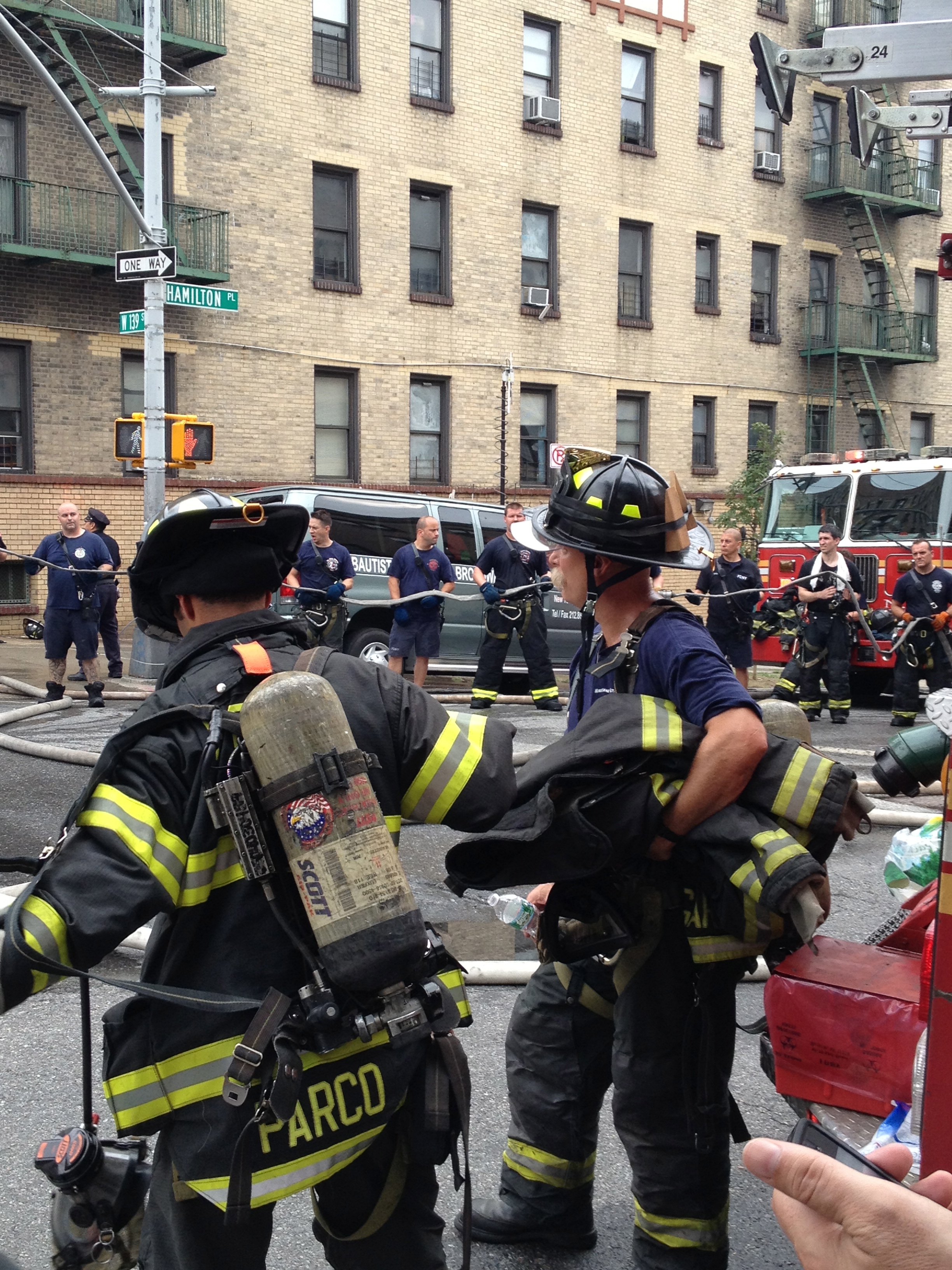 Here are a few photos from the fifth alarm fire on West 139th St. in Manhattan yesterday. The fire broke out on the sixth floor of an apartment house and quickly spread to the cockloft. I grabbed my phone and jumped on the subway in time to get a few photos, although the job was mostly done and the engines started taking up shortly after I got there.